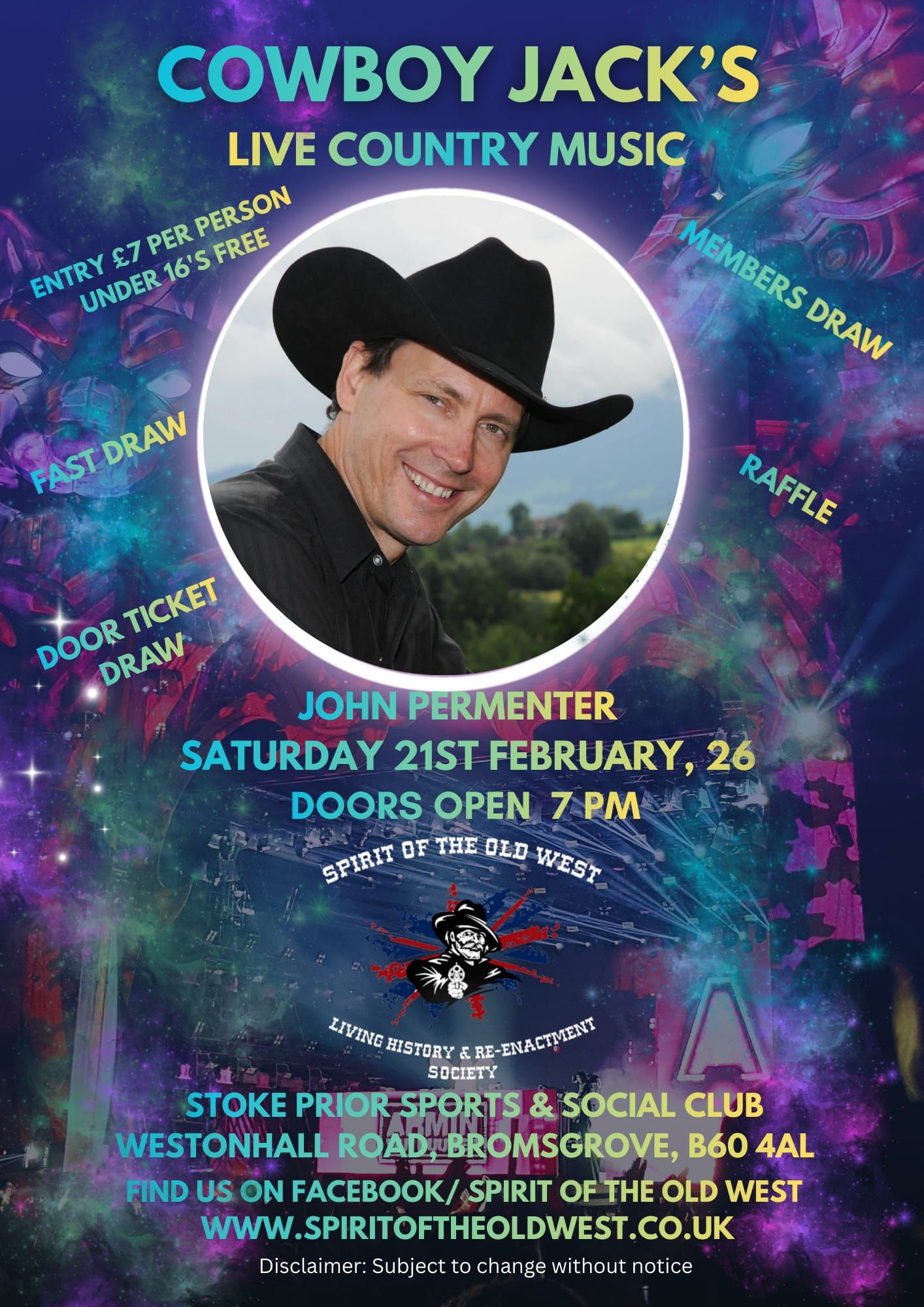 Spirit of the Old West & Cowboy Jack's present live Country music with John Permenter. Doors open 7pm Entry £7 per person (under 16's free of chage) https://www.spiritoftheoldwest.co.uk/